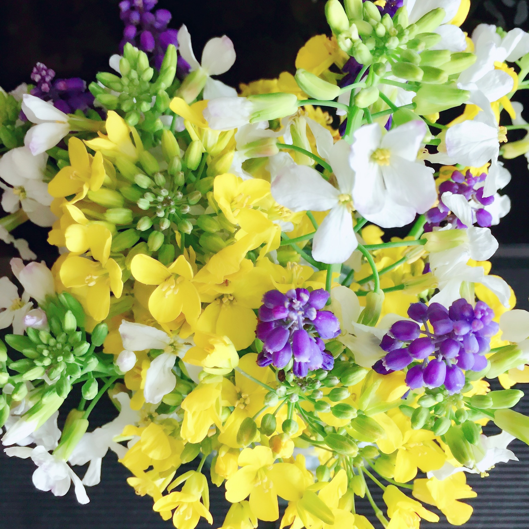 畑に咲いていた菜の花と大根の花、庭のムスカリを一緒に。春の匂い💛💛💛✨