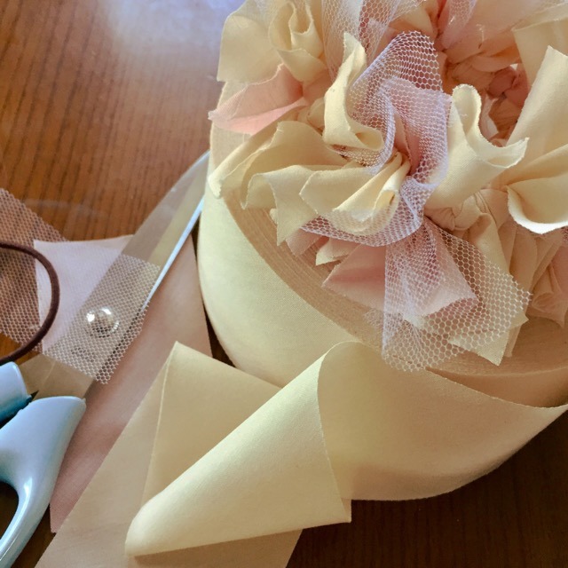 お花のコットンシュシュのミックスバージョン試作しています。優しくふんわりした雰囲気になりました。お色はアイボリー&ピンク。