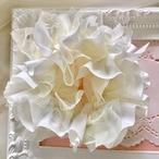 カットしたピュアホワイトの綿ポリエステル地とチュールを一枚ずつ丁寧に結びつけて作ったシュシュです。素材の関係で他のコットンシュシュに比べると、パリッとしっかりした風合いのお花です。今回チュール を増量した事によりフワフワ感UPさせました。これからの季節にいかがでしょうか?束ねた髪はもちろん、まとめ髪のシニョンに巻いたり、エレガントなアームバンドとしても楽しめます。また、ラッピングした瓶のネックに付けてプレゼントするなどお洒落に使う事が出来ます。直径約11cm 。黒の丸ゴム使用。