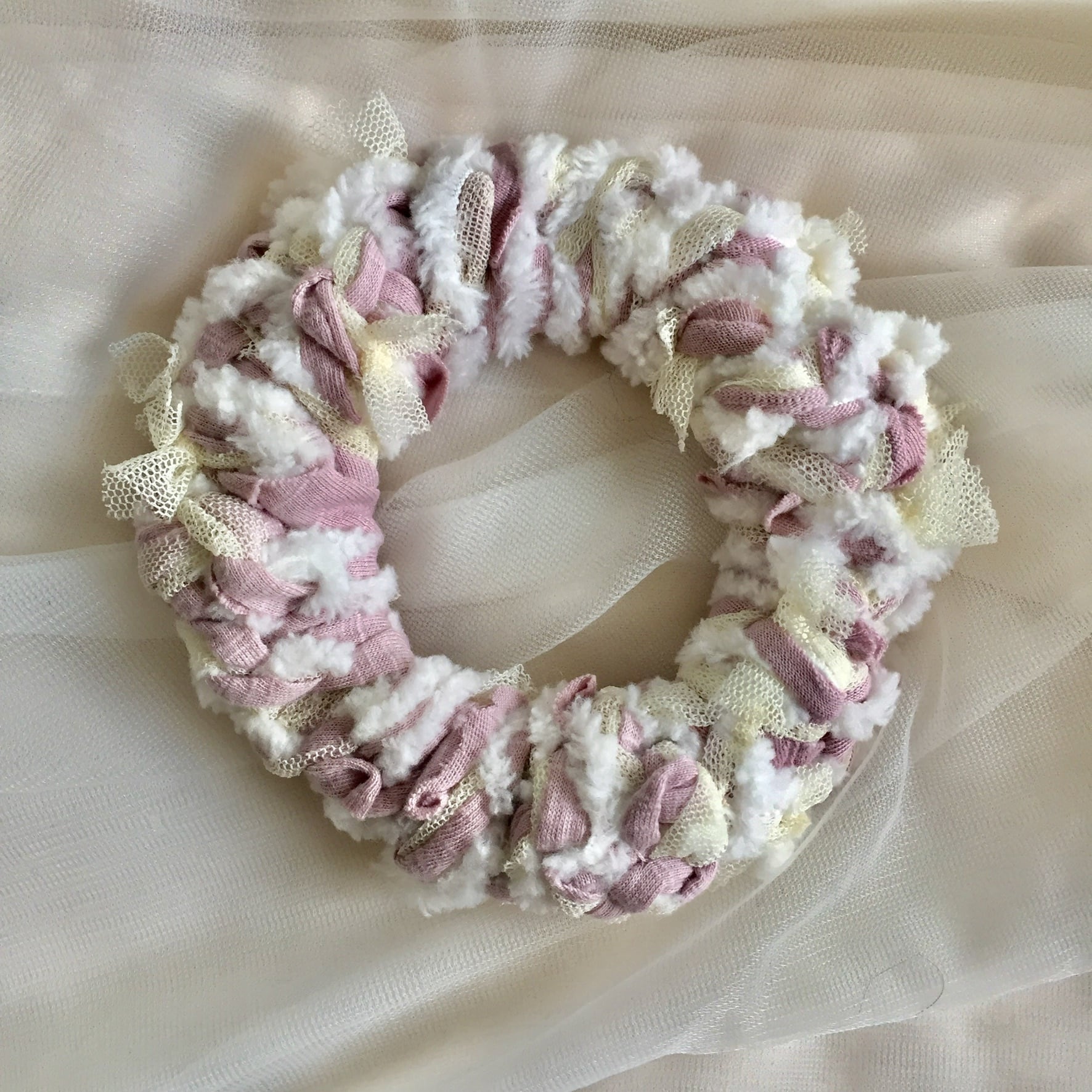 使用糸は毛足の長いフワフワの白毛糸、アイボリーのチュールと、くすみピンクの裂き布。密度の濃いしっかりした仕上がりのシュシュです。黒の丸ゴム使用。直径約11cm。