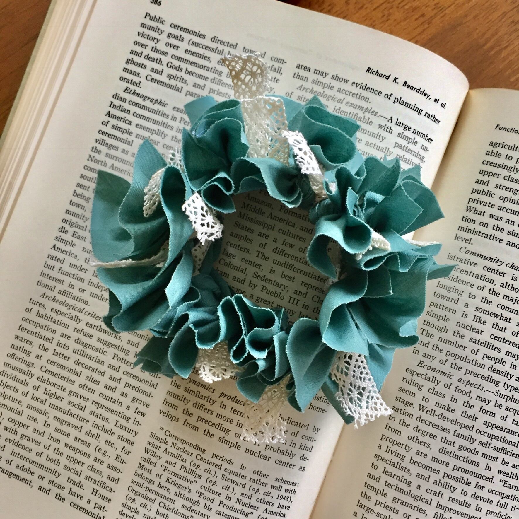 カットしたグリーン系の綿ブロード地と、レーステープを一枚ずつ丁寧に結びつけて作ったシュシュです。くすみ系の色合いで落ち着いた大人な雰囲気を、紅茶染めしたレースでレトロな感じをプラスしてみました。さりげないお洒落なアイテムとしていかがでしょうか?束ねた髪はもちろん、まとめ髪のシニョンに巻いたり、エレガントなアームバンドとしても楽しめます。また、ラッピングしたボトルのネックに付けてプレゼントするなどお洒落に使う事が出来ます。直径約11cm 。黒の丸ゴム使用。