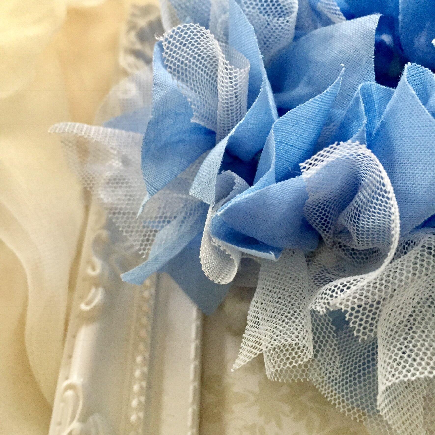 カットした濃いめのウォーターカラーの綿ブロード地、同色のチュール地を一枚ずつ丁寧に結びつけて作ったシュシュです。爽やかな初夏の風イメージして作りました。さらっとした風合いの涼しげなシュシュです。これからの季節、さりげないお洒落なアイテムとしていかがでしょうか?束ねた髪はもちろん、まとめ髪のシニョンに巻いたり、エレガントなアームバンドとしても楽しめます。また、ちょっとしたプレゼントなど様々な用途に使う事が出来ます。直径約11cm 黒の丸ゴム使用。