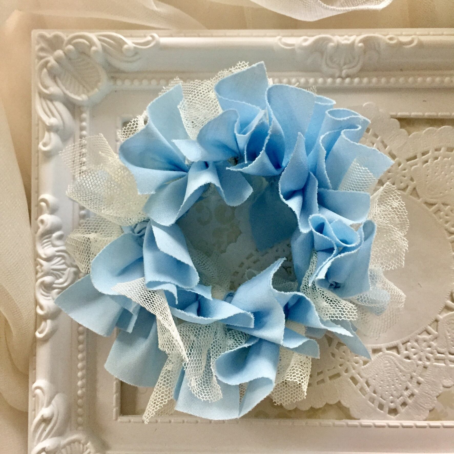 カットしたウォーターカラーの綿ブロード地にアイボリーのチュール地を一枚ずつ丁寧に結びつけて作ったシュシュです。(チュールは増量タイプで無地とドット柄をミックスしています。)お色は淡い水色の単色です。爽やかな初夏の風をイメージして作りました。ボリュームもあり、サラサラふわふわの可愛らしいシュシュです。これからの季節、さりげないお洒落なアイテムとしていかがでしょうか?束ねた髪はもちろん、まとめ髪のシニョンに巻いたり、エレガントなアームバンドとしても楽しめます。また、ちょっとしたプレゼントなど様々な用途に使う事が出来ます。直径約11cm 黒の丸ゴム使用。