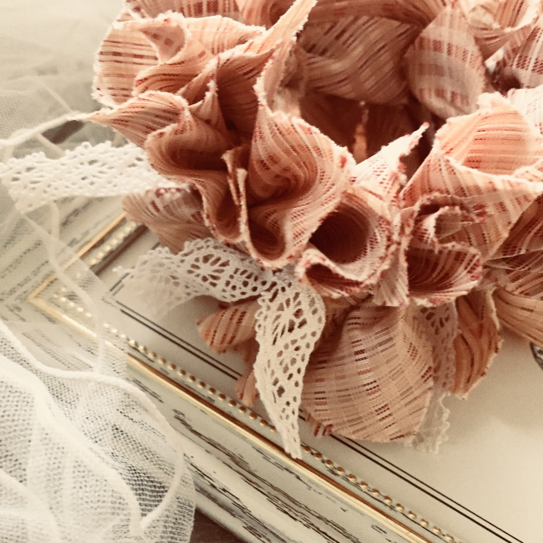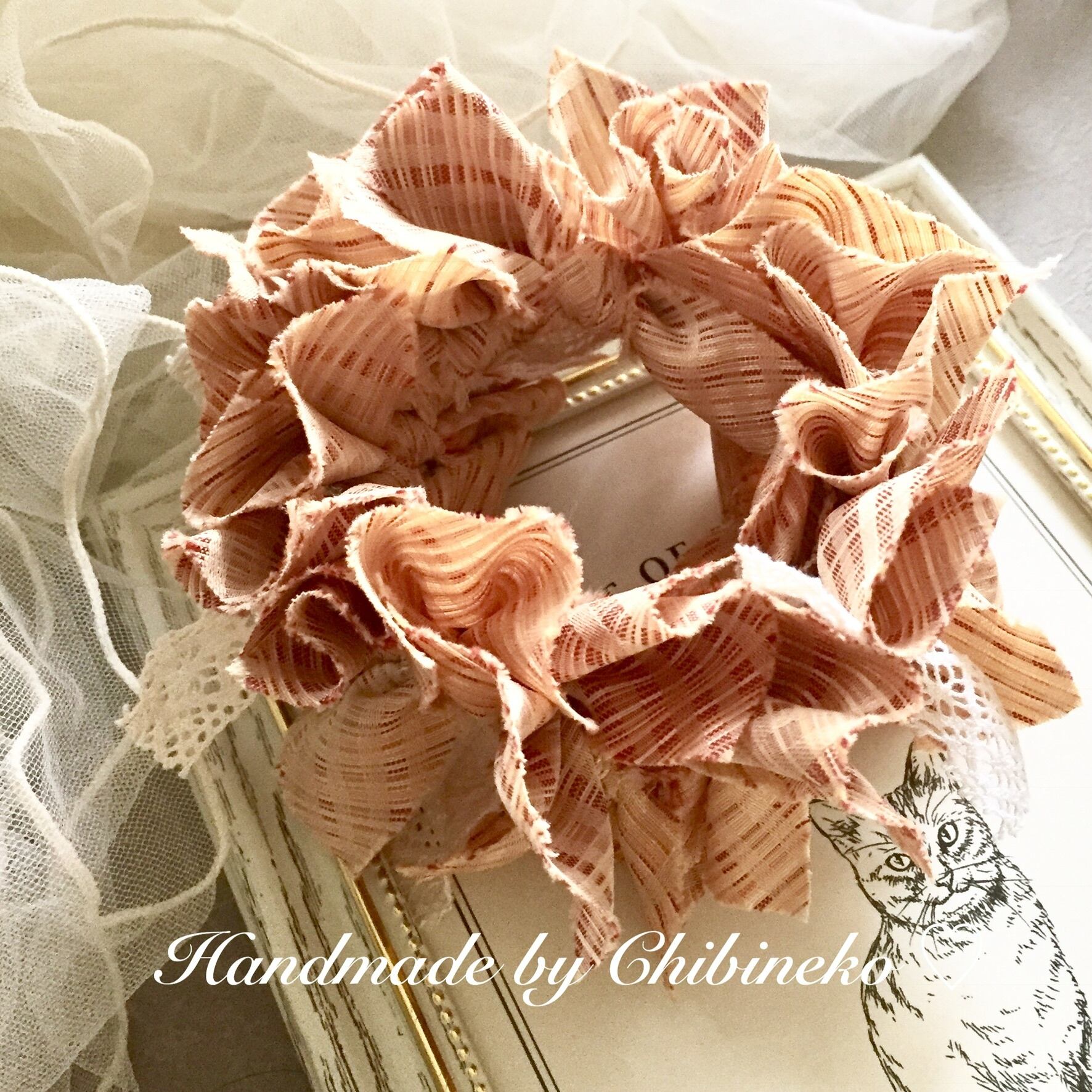 カットした広幅のバイアステープを一枚ずつ丁寧に結び付けて作ったシュシュです。布地は先染めの糸で織ったチェック柄です。ベージュの糸を基本に茶やオレンジ、白などの糸で織られている為、全体的には落ち着いた淡いオレンジのようなお色です。花びらの間に紅茶染めをしたトーションレースを挟み込み、チュールを使わずに布地の持ち味を生かしました。カジュアルな中にもレトロを感じさせるキュートな雰囲気のシュシュです。たっぷりの布地を使いボリュームもあり、しっかりした触感です。束ねた髪はもちろん、まとめ髪のシニョンに巻いたり、エレガントなアームバンドとしても楽しめます。また、大切な人へのプレゼントなど様々な用途に使う事が出来ます。直径約11cm 。黒の丸ゴム使用。