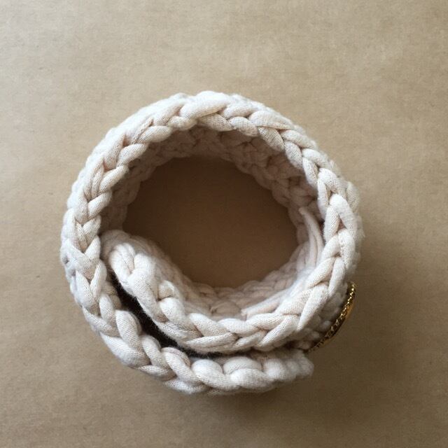 裂き布の定番Tシャツヤーンを鍵編みしました。とても肌に馴染みやすくしっかりした作りになっています。お色は明るいベージュ。自然色なのでどんなコーデにも合わせやすいかと思います。ポイントのビンテージボタンはバングルの裏側にヤーンで結んでありますので、お好きなサイズに付け替えて頂く事も可能です。サイズ縦5cm,横27cm。輪にした時の直径7.5cm(写真撮影時)