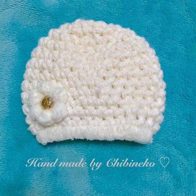 雪のように白い極太毛糸を指編みしています。お花のモチーフと縁取りに毛足の長いフワモコの毛糸を使ってみました。キュートな形が愛らしいニット帽です。帽子の縁の伸びや型崩れ防止とフィット感を増すために極細の白ゴムを仕込んであります。フリーのレディースサイズです。